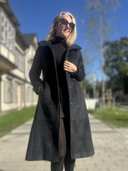 Warm insulation. 3M™ Thinsulate™ Insulation is warm yet lightweight, powerful yet thin. It helps trap body heat, while allowing moisture to escape. Maintenance: dry cleaning. If you are looking for the perfect winter coat, our navy blue woolen winter coat is just what you need! The coat offers warmth and comfort for every winter day, thanks to the warm insulation that keeps you warm even in the coldest weather. A removable hood adds practicality so you can adapt the style – wear it on windy days or remove the hood for calmer moments. Elegant, durable and timeless, this coat is the perfect companion for both everyday wear and formal occasions. Complete your winter wardrobe with luxurious comfort! The model is 173cm tall and wears coat no. 36.