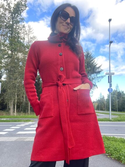 Thanks to the thicker coat-weight fabric, this cardigan is perfect for cooler weather and keeps you pleasantly warm. By tying the belt around the waist, you can create a beautifully feminine silhouette. It’s the ideal choice when you want the light comfort of a coat with the freedom and versatility of a cardigan. The cardigan also features two cosy large pockets.