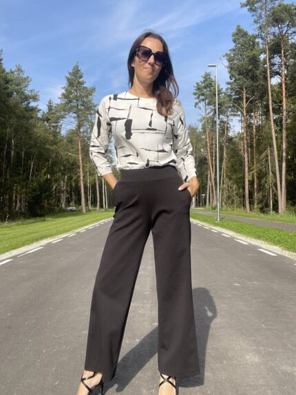 Trendikalt alt laieneva säärega püksid. Kangas on kaunilt langev. Pükstel on vöökoht mugava kummiga ja venib mõnusasti vastavalt kandja kehakujule. Külgedel kaks suurt taskut. Pehme ja veniv kangas teeb kandmise mugavaks. Püksid on valmistatud kangast, millel on OEKO-TEX® 100 sertifikaat. OEKO-TEX® 100 sertifikaat tähendab, et kangaid on testitud kahjulike ainete suhtes ja need on inimese tervisele kahjutud. Hooldus: masinpesu. Modell on 173cm pikk ja kannab 36 suuruses pükse.