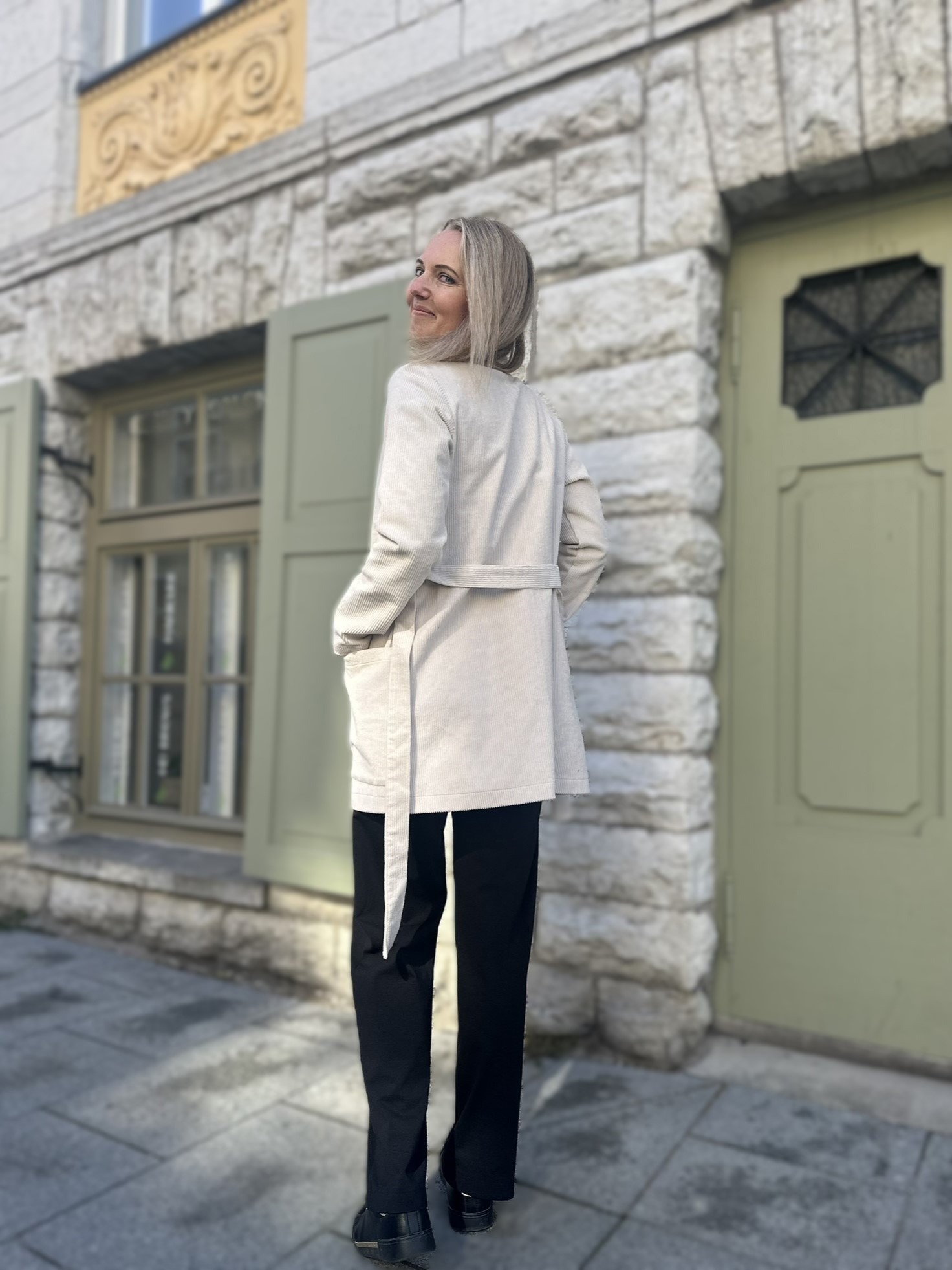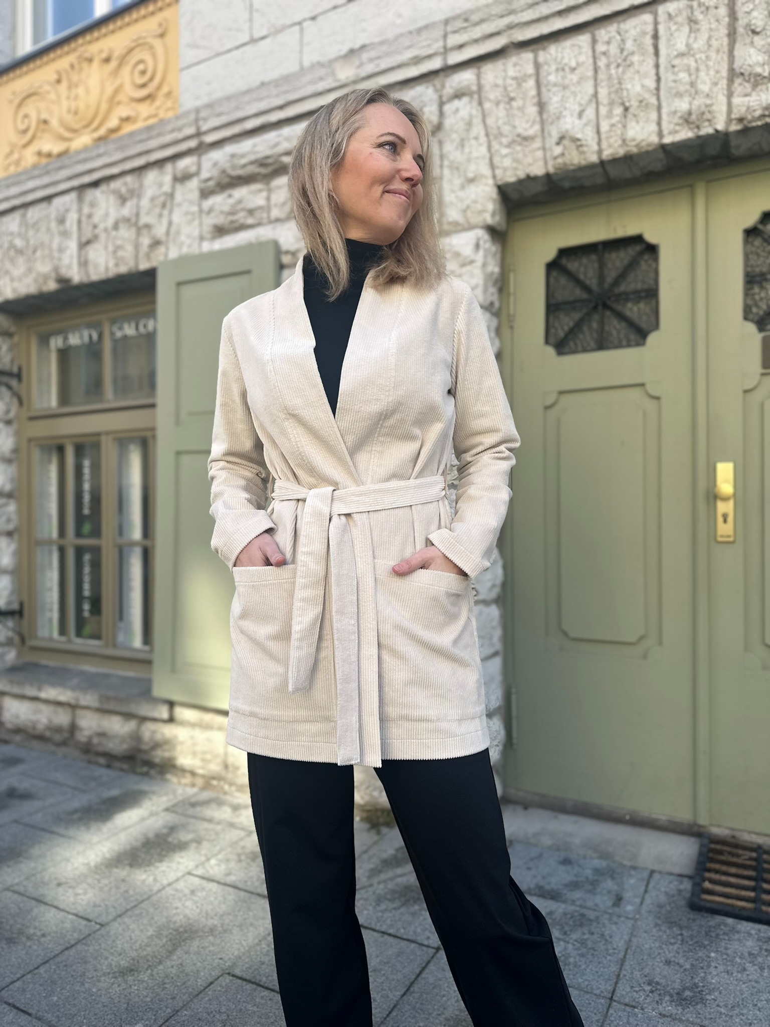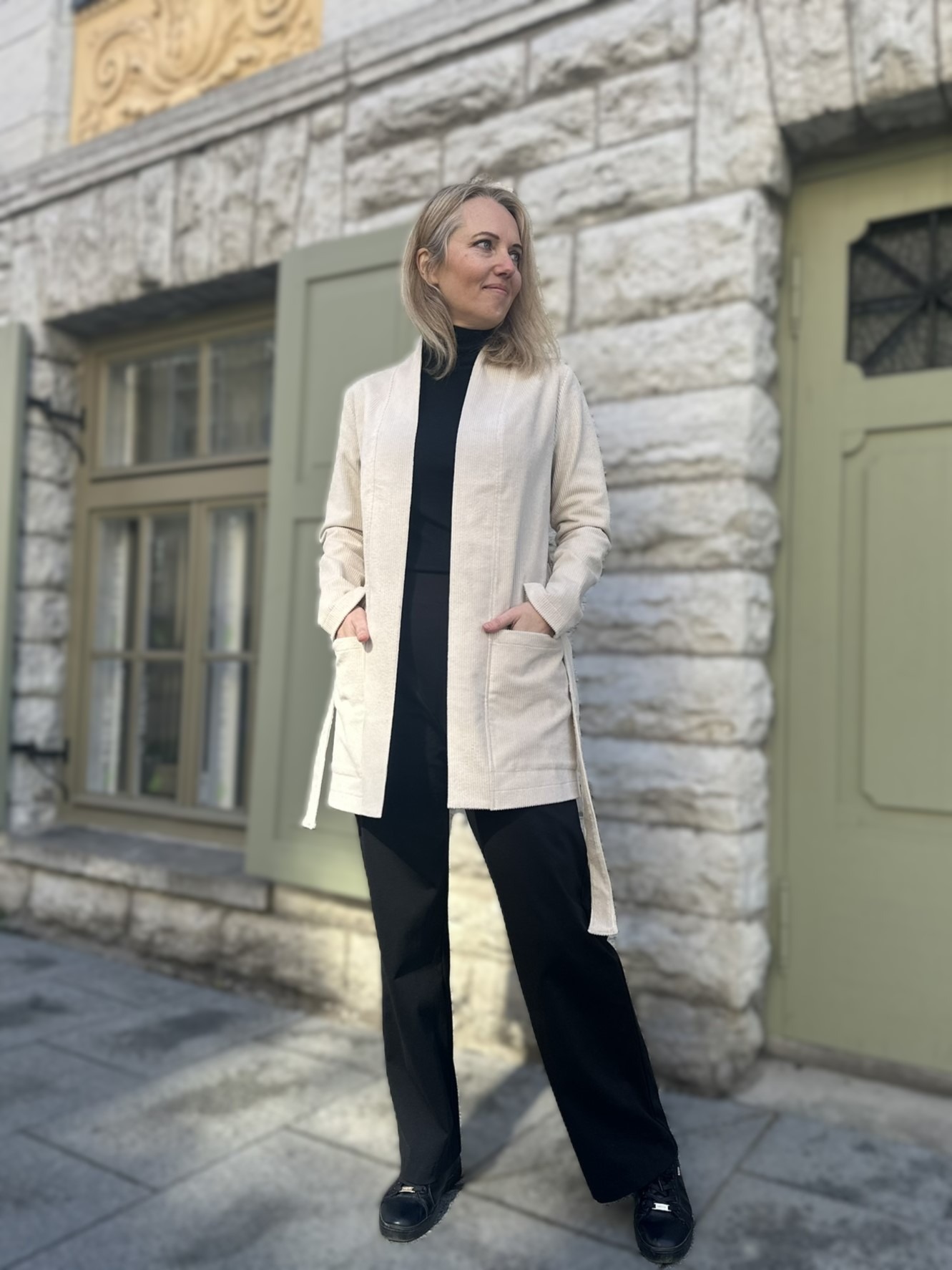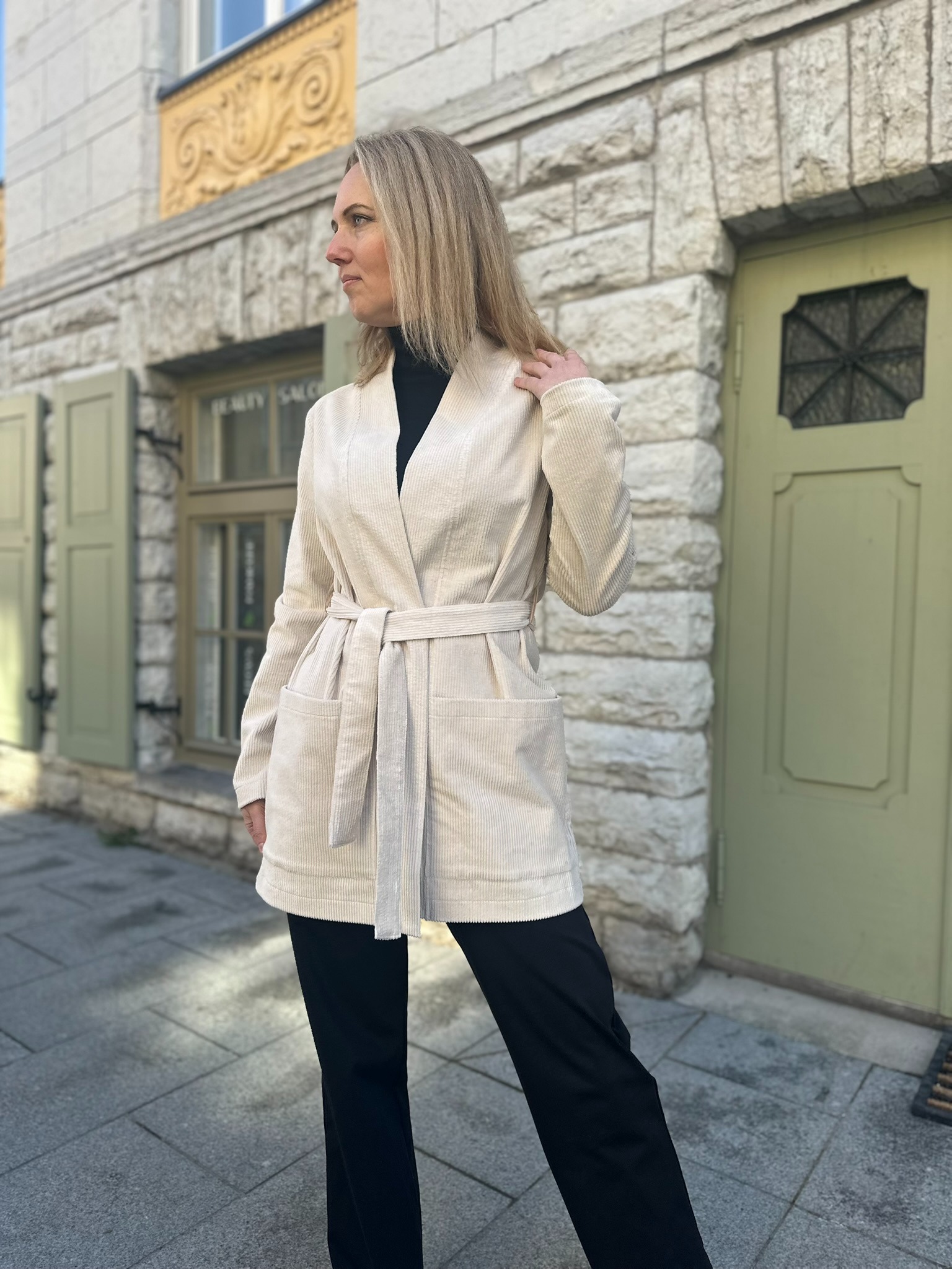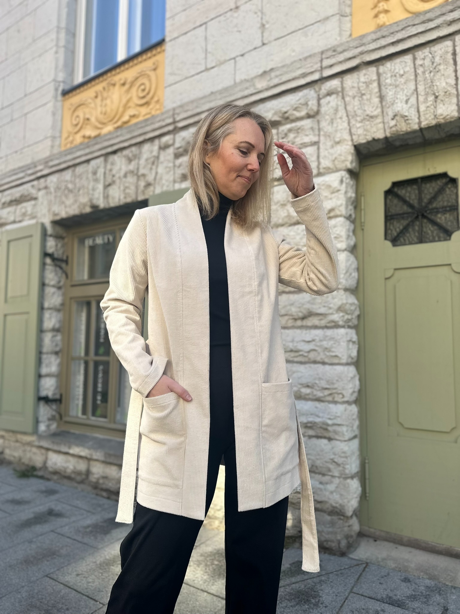 Minimalistlik lõige ja puhas joon annavad võimaluse kanda kardigani nii avatult kui ka vööga seotuna. Nii saad luua kas vabalt langeva või taljet rõhutava silueti – vastavalt tujule ja olukorrale.
