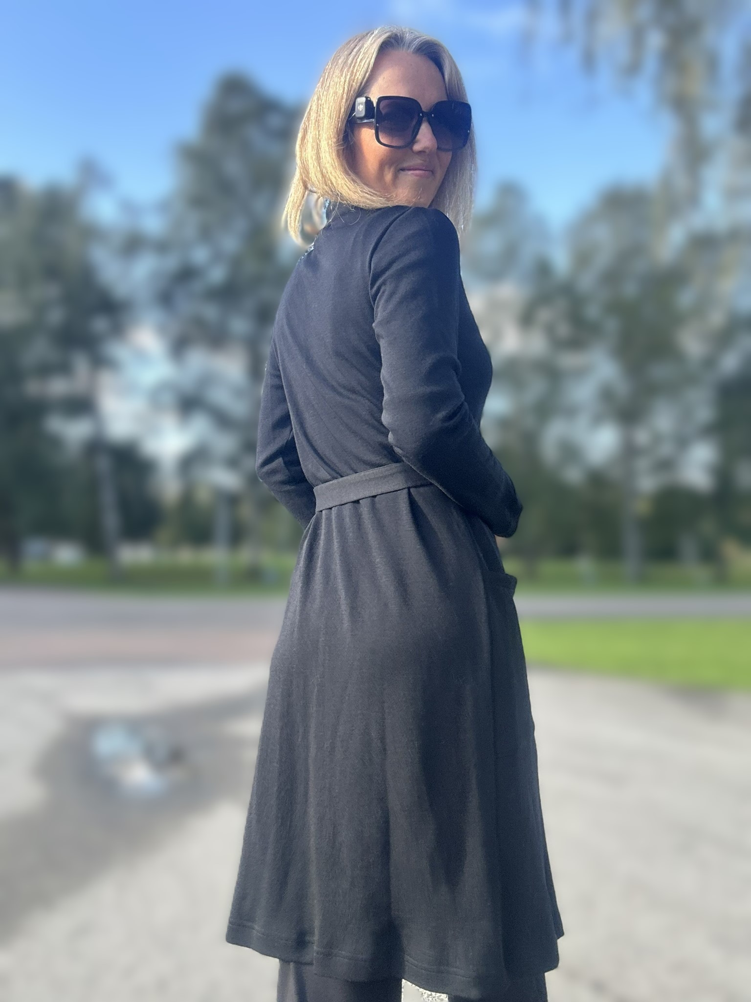 Elegantne 100% meriinovillane kardigan. See pehme ja ajatu kardigan on kootud 100% meriinovillast — looduslikust materjalist, mis on hinnatud oma suurepäraste omaduste poolest. Meriinovill on hingav, hoiab hästi sooja ja juhib niiskust eemale, nii et tunned end mugavalt ka jahedamal päeval, ilma et hakkaks palav. Kangas on loomulikult antibakteriaalne ja mõnusalt pehme vastu nahka. Meriinovill on üks maailma pehmemaid villu ega torgi. Paljud, kes tavaliselt ei saa kanda villaseid tooteid, sest need ajavad sügelema, tunnevad end meriinovillases kardiganis suurepäraselt. Kardigan on klassikalise lõikega ja mugav visata õlgadele nii kontoris, kodus kui ka õues jahedama ilmaga. Sobita oma lemmikkleidi, pluusi või pükstega — meriinovillane kardigan täiendab iga komplekti ja on asendamatu kiht muutlike ilmade jaoks.