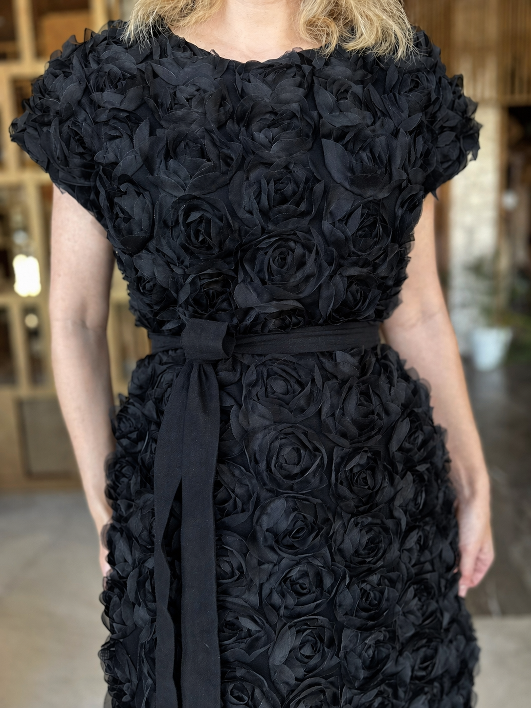 Kleit on valmistatud kangast, mida kaunistavad ruumilised 3D lilled, andes kleidile erilise ja piduliku ilme. Kangas on kerge ja mugav kanda, samas hoiab kleit oma kauni vormi ning langeb kaunilt. Pehme puuvillane vooder lisab kandmismugavust ja laseb nahal hingata, muutes kleidi sobivaks ka pikemaks kandmiseks.