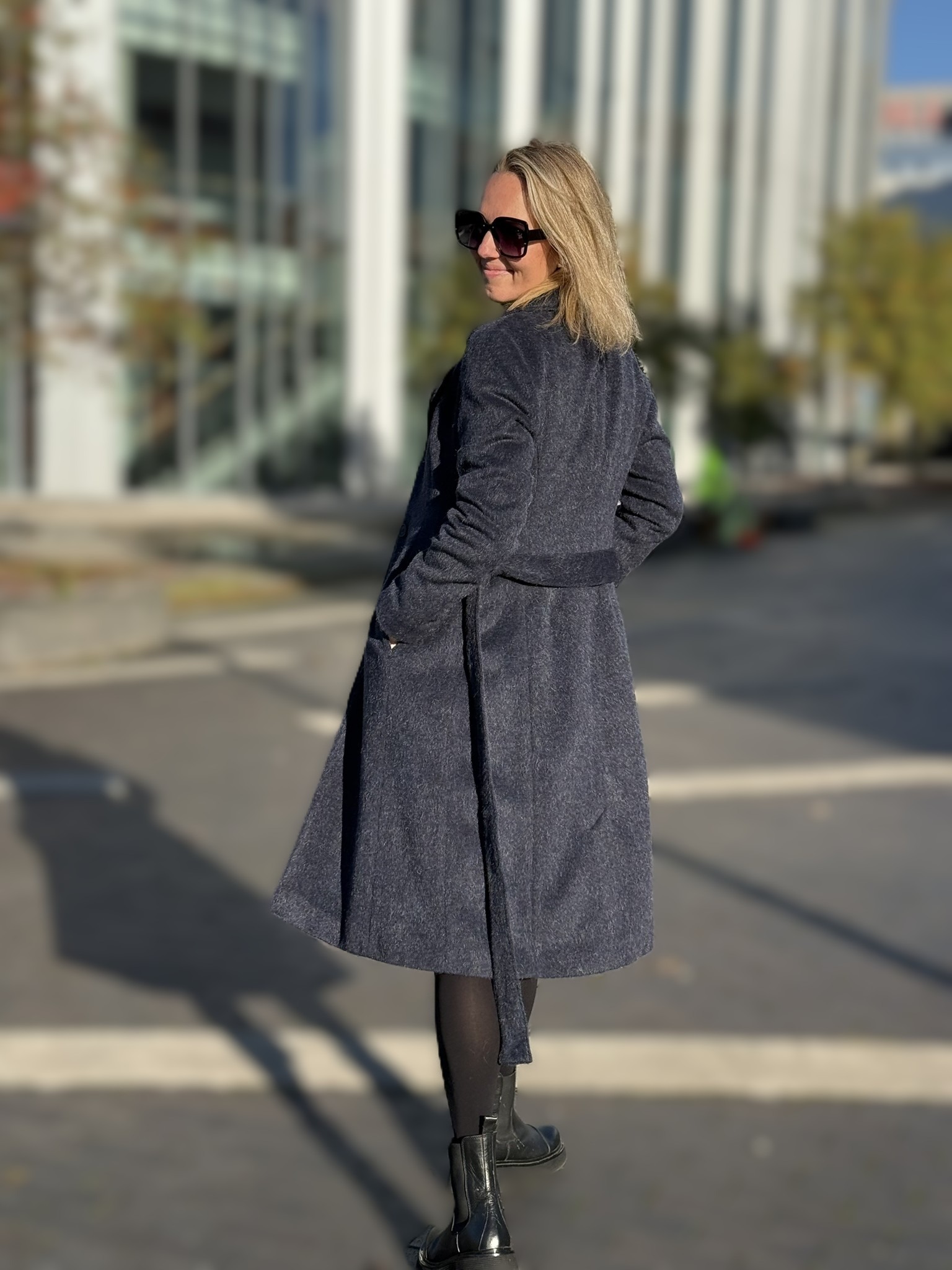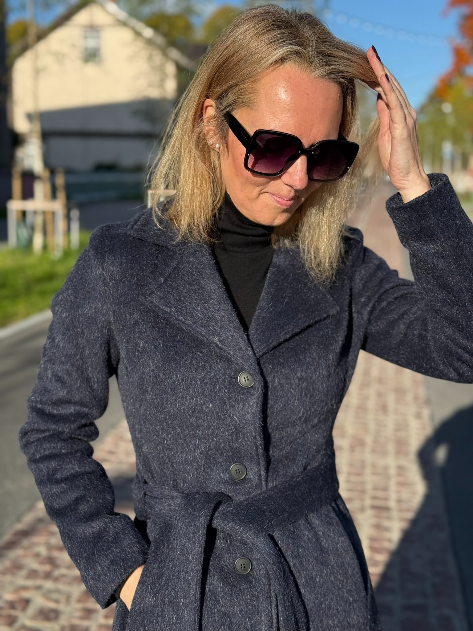Mantel on valminud luksuslikust peenvillasest kangast, millele lisab pehmust eksklusiivne mohäär. Peenvill annab loomuliku soojustunde, hingavuse ja pehmuse, mohäär lisab luksuslikku siidisust ja erakordset soojust hoidvat omadust. Polüamiid tagab vastupidavuse ja aitab mantlil hoida oma kaunist vormi ka ajapikku. Kaks taskut. Pealepandav vöö. Hooldus: keemiline puhastus. Mudel on disainitud nii, et kui inimese mõõt on näiteks 38, siis ostes 38 suuruses mantli, on see üsna ümber. Kui soovid mantlile veidi rohkem vabadust ja ka näiteks soojema kampsuni alla panna, soovitame võtta suuruse 40. Modell on 173cm pikk ja kannab mantlit nr 36.