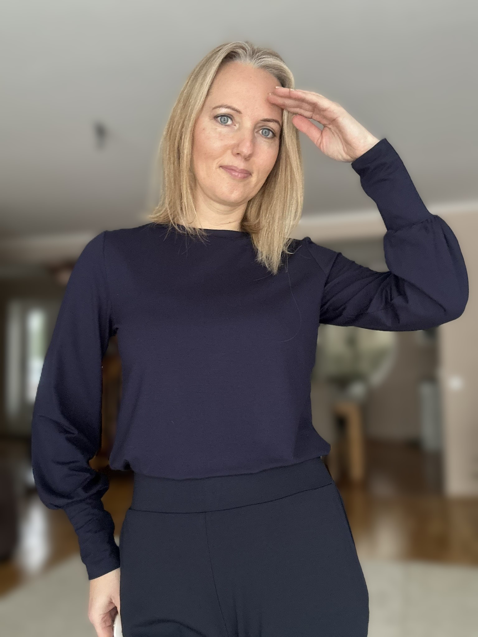 Tumesinine luksuslik pluus kroogitud varrukaga