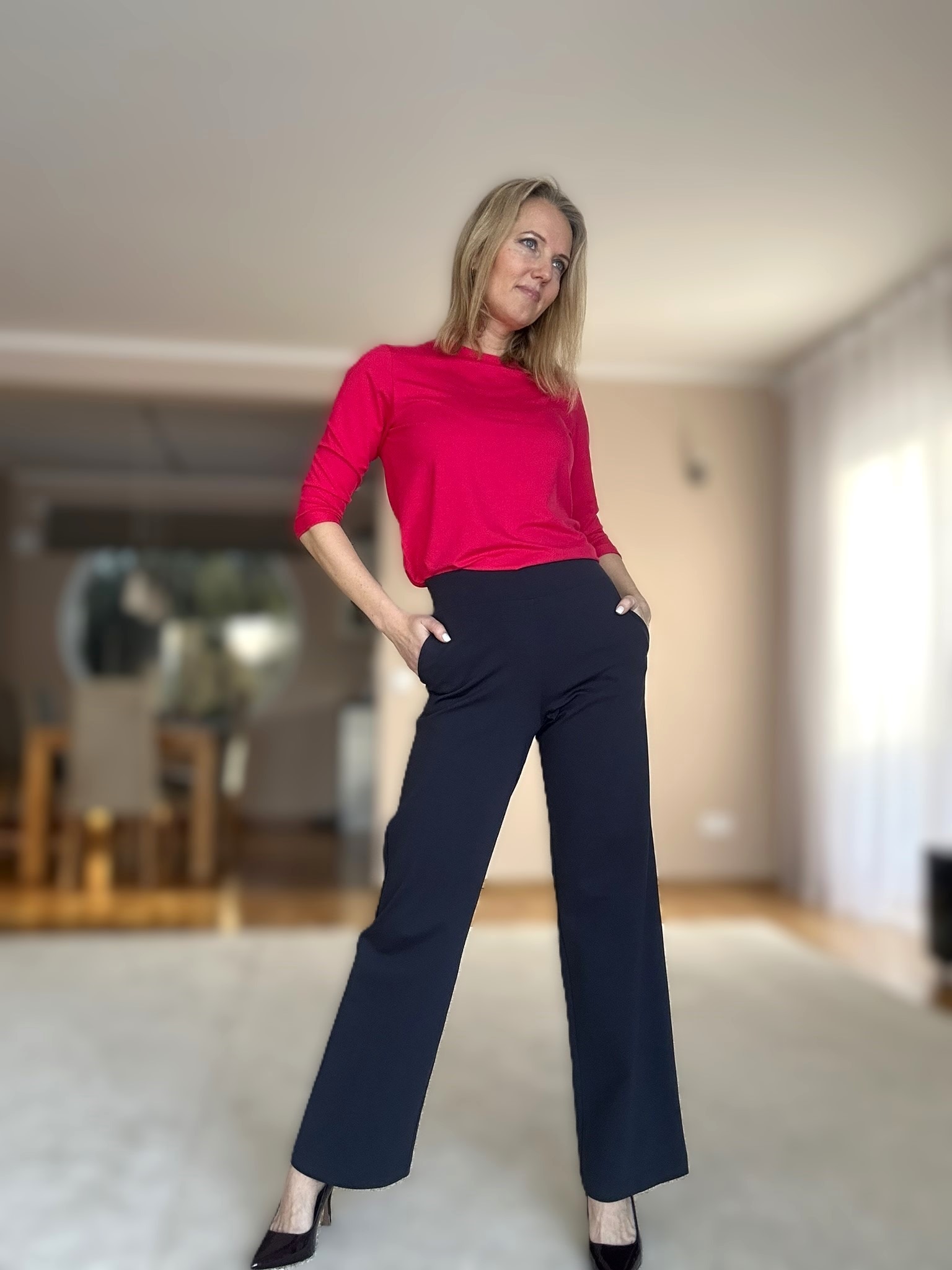 Trendikalt kõrgema pihaosa ja alt laieneva säärega püksid. Pükstel on vöökoht mugava kummiga ja venib mõnusasti vastavalt kandja kehakujule. Külgedel kaks suurt taskut. Pehme ja veniv kangas teeb kandmise mugavaks. Hooldus: masinpesu. Modell on 173cm pikk ja kannab pükse nr 36.