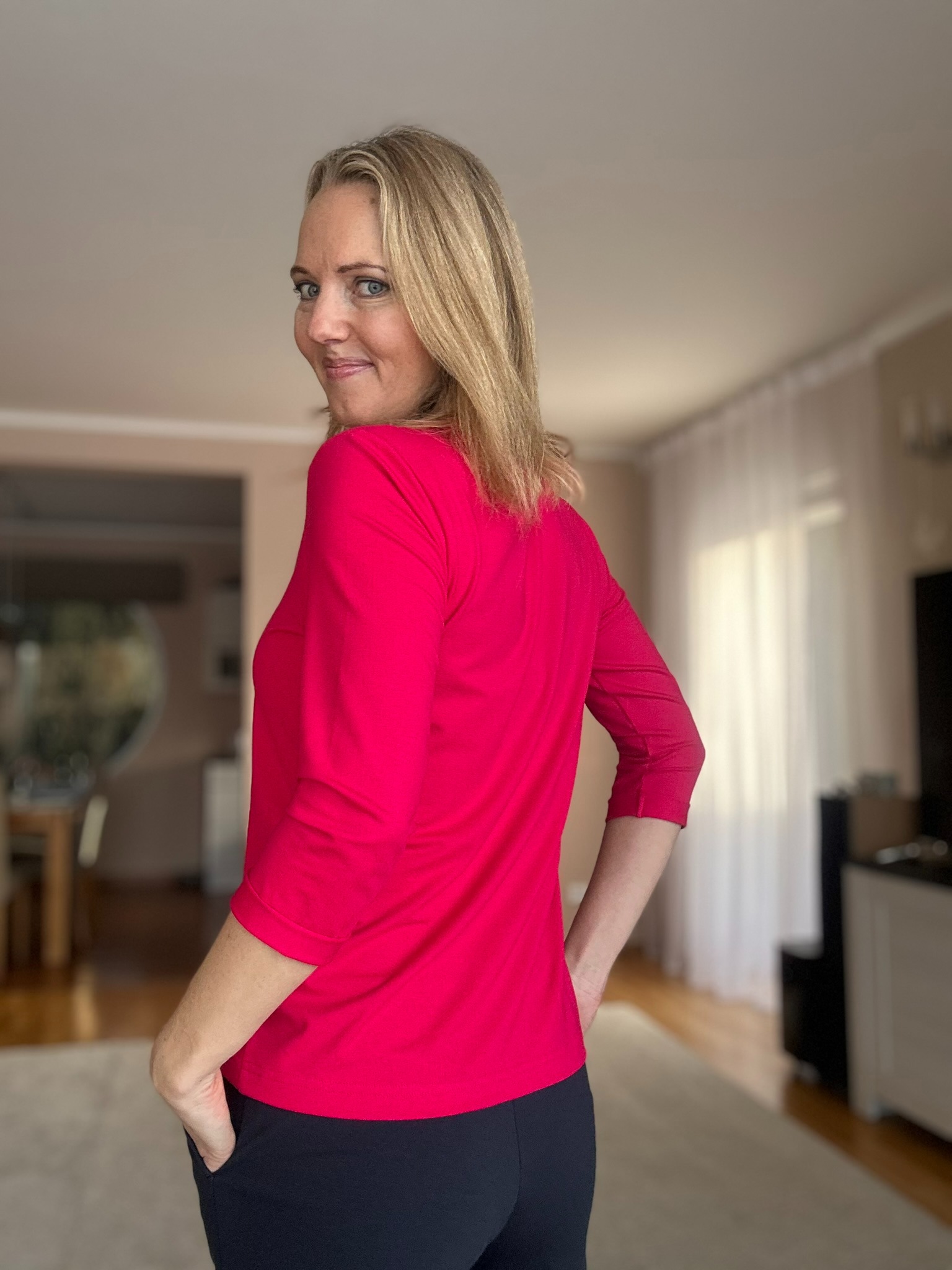 Pehmest ja venivast viskoostrikotaažist kolmveerandvarrukaga pluus ühendab igapäevase mugavuse ja elegantse välimuse.