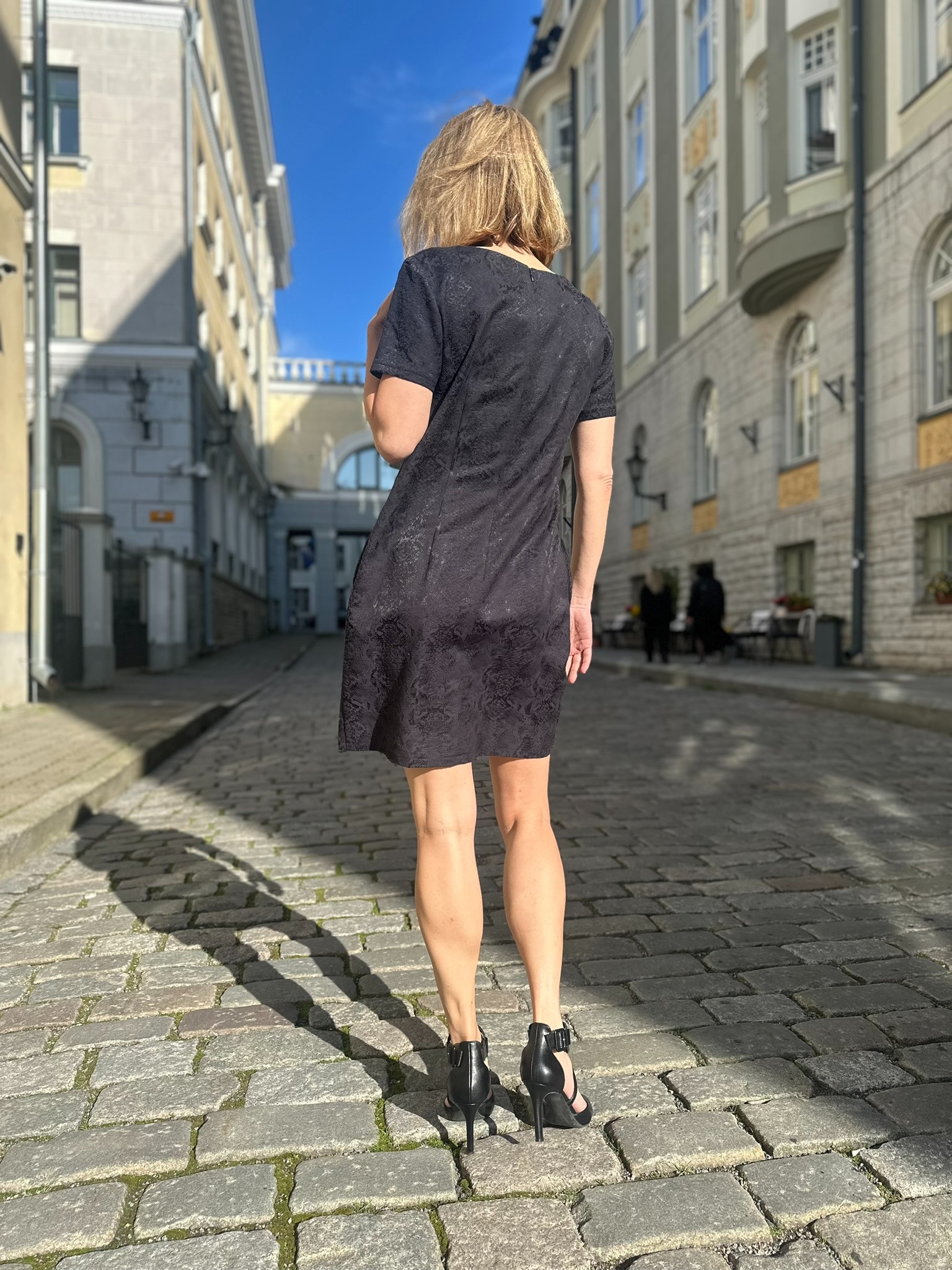 Külgedel 2 taskut, selja taga lukk. Hooldus: masinpesu. Modell on 173cm pikk ning kannab 38 suuruses kleiti.
