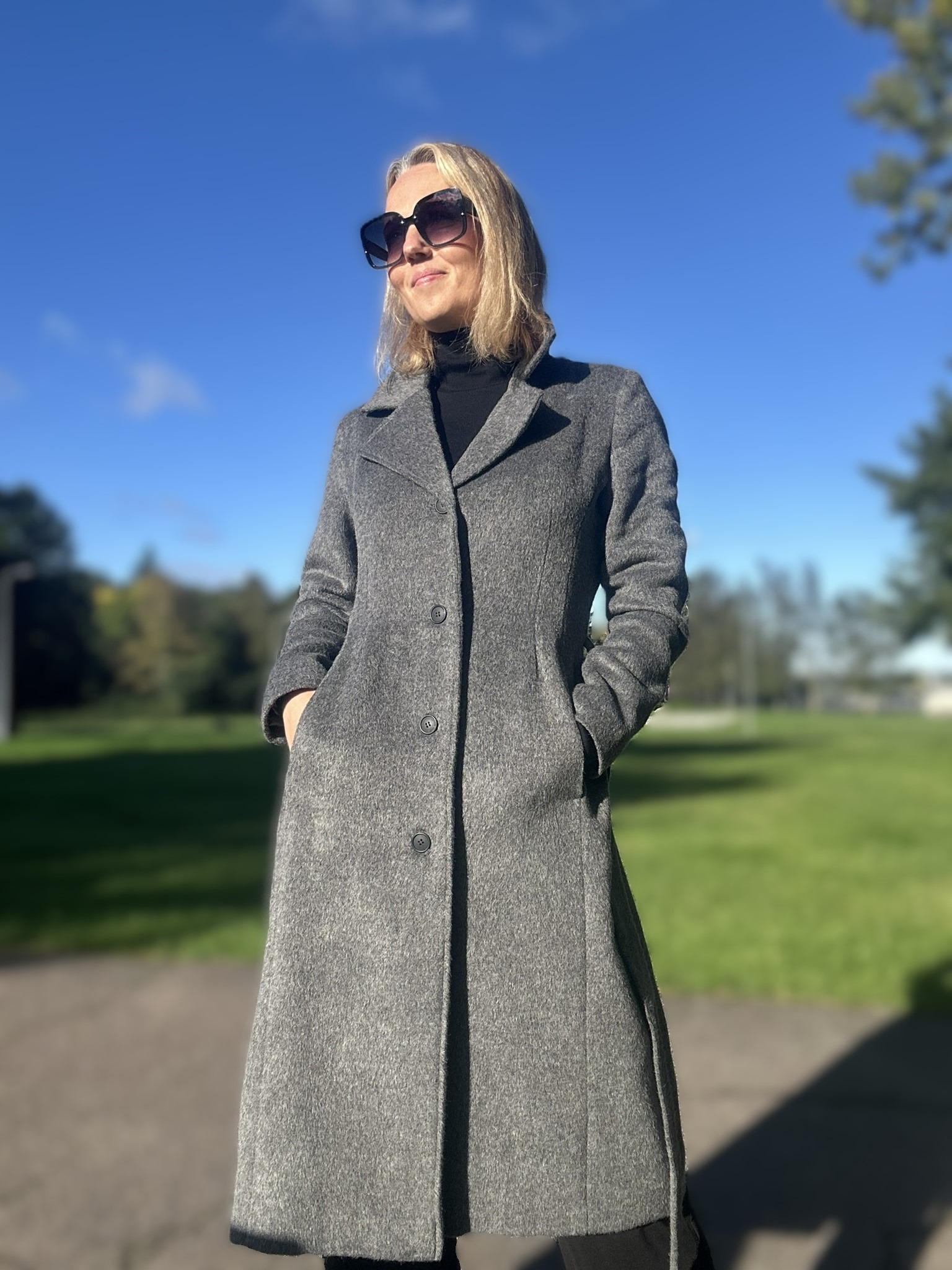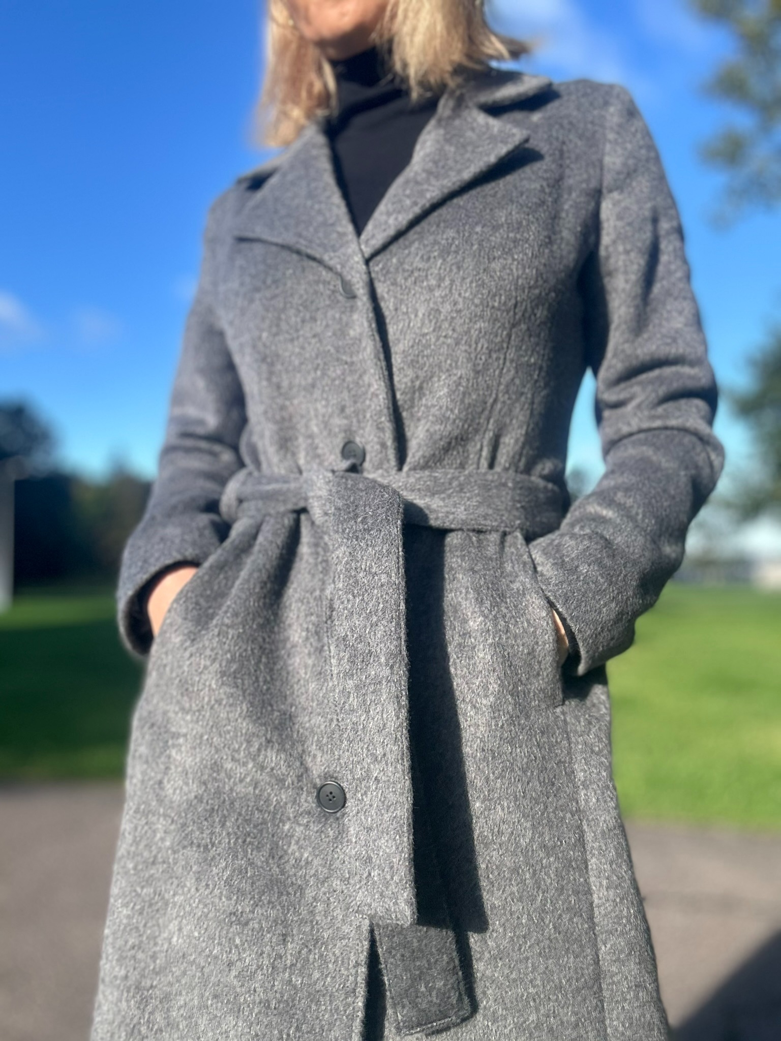 Mantel valmib tellimisel kahe nädala jooksul. Mantlile kehtib ka tagastusvõimalus 14 päeva jooksul! Mantel on valminud luksuslikust peenvillasest kangast, millele lisab pehmust eksklusiivne mohäär. Peenvill annab loomuliku soojustunde, hingavuse ja pehmuse, mohäär lisab luksuslikku siidisust ja erakordset soojust hoidvat omadust. Polüamiid tagab vastupidavuse ja aitab mantlil hoida oma kaunist vormi ka ajapikku. Kaks taskut. Pealepandav vöö. Hooldus: keemiline puhastus. Mudel on disainitud nii, et kui inimese mõõt on näiteks 38, siis ostes 38 suuruses mantli, on see üsna ümber. Kui soovid mantlile veidi rohkem vabadust ja ka näiteks soojema kampsuni alla panna, soovitame võtta suuruse 40. Modell on 173cm pikk ja kannab mantlit nr 38.
